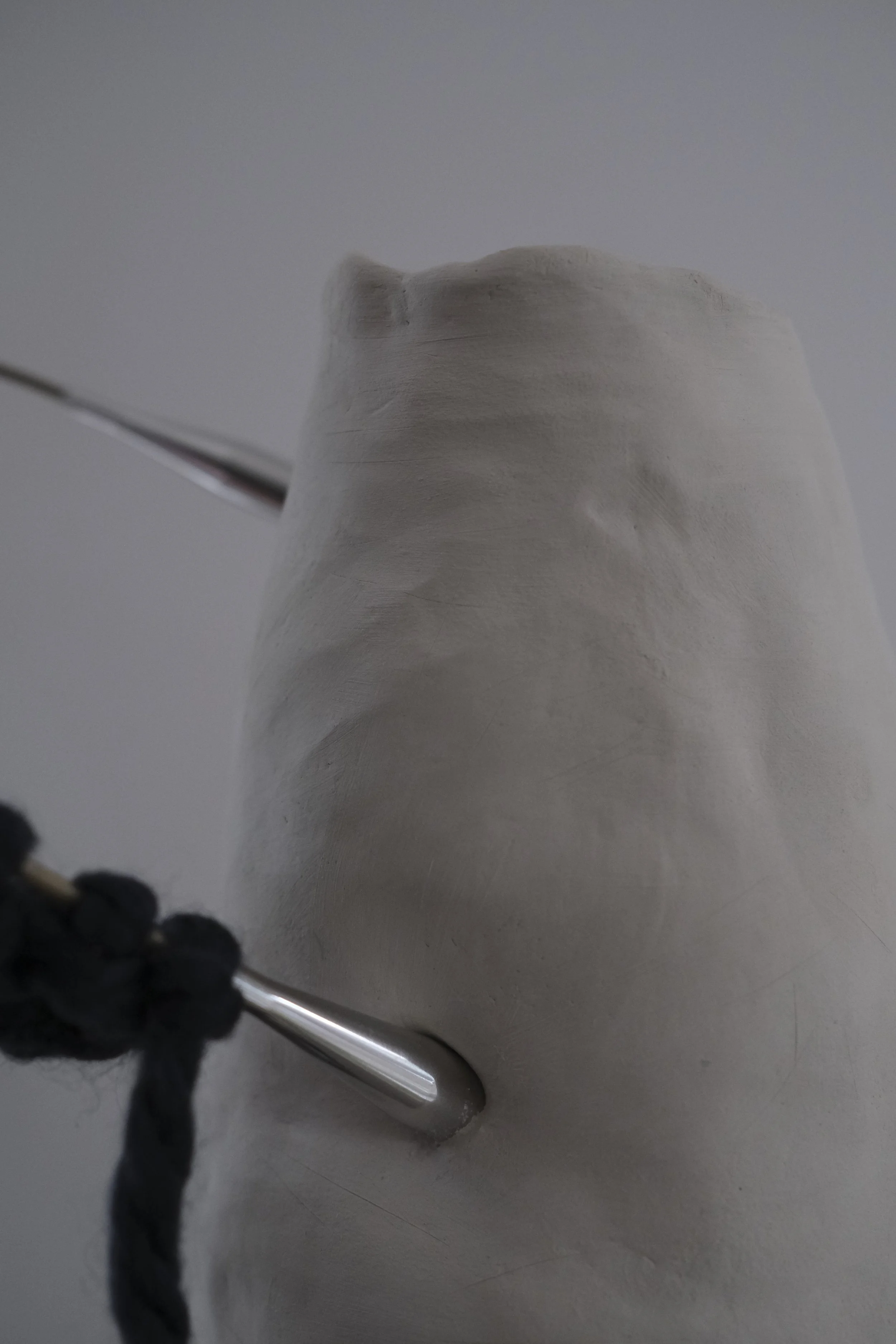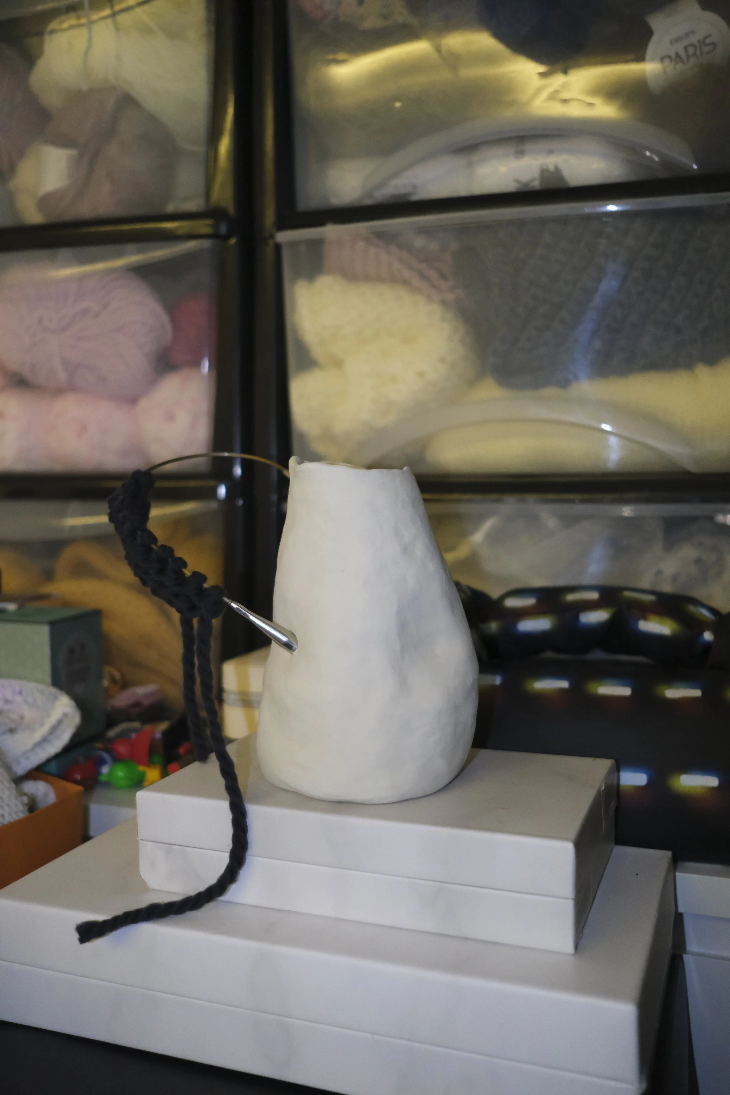 This is the first experiment to establish a hands-on ritual of making, inspired by Cherry Wan’s story. As knitting and crocheting are her own way of spending quality time with herself, I incorporated the knitting process and the needles into the vase itself, to create material contrasts. The artificial marks and human touches left on the vase are also parts of the intentions, as she finds stains and marks are proof of her existence in the space. The whole process of making can be found HERE.
